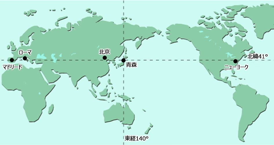 青森県は、北緯40度12分から41度33分、東経139度30分から141度41分の間の本州最北にあり、ニューヨーク、北京、ローマ、マドリードとほぼ同緯度に位置しています。