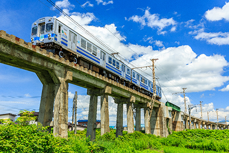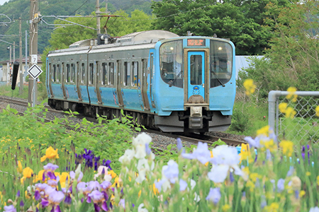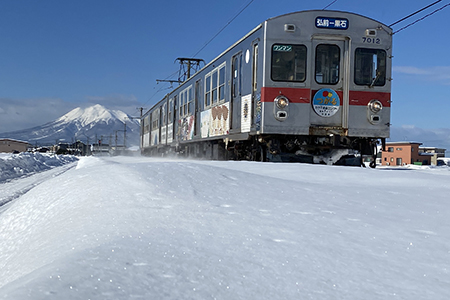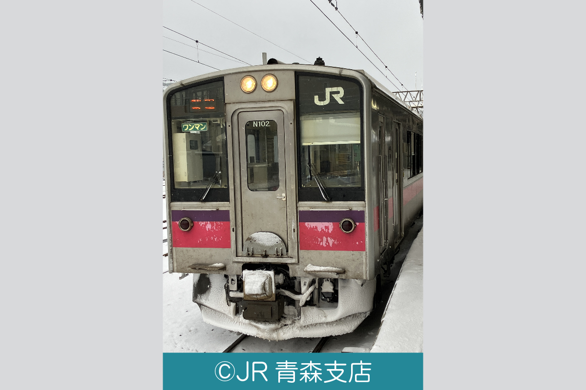 奥羽本線は、福島駅から山形県・秋田県を経由して青森駅まで、東北を縦貫している鉄道です。青森県内には、津軽湯の沢駅(平川市)から青森駅までの15駅があります。明治時代に全線が開通してから、通勤通学など津軽で暮らす人々の生活に多く利用され、津軽地域に欠かせない交通網となっており、車窓からは岩木山と津軽平野の田園風景が楽しめます。